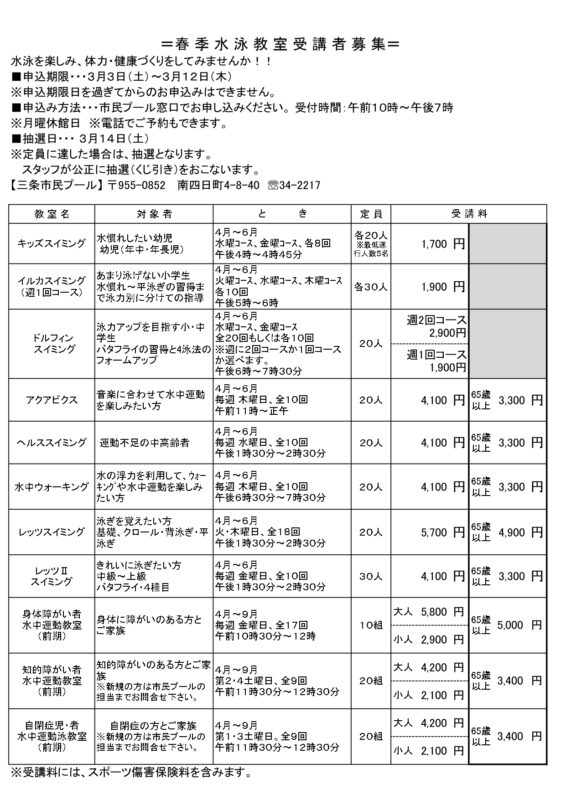 冬季水泳教室PDFはこちら⇒春季水泳教室受講者募集