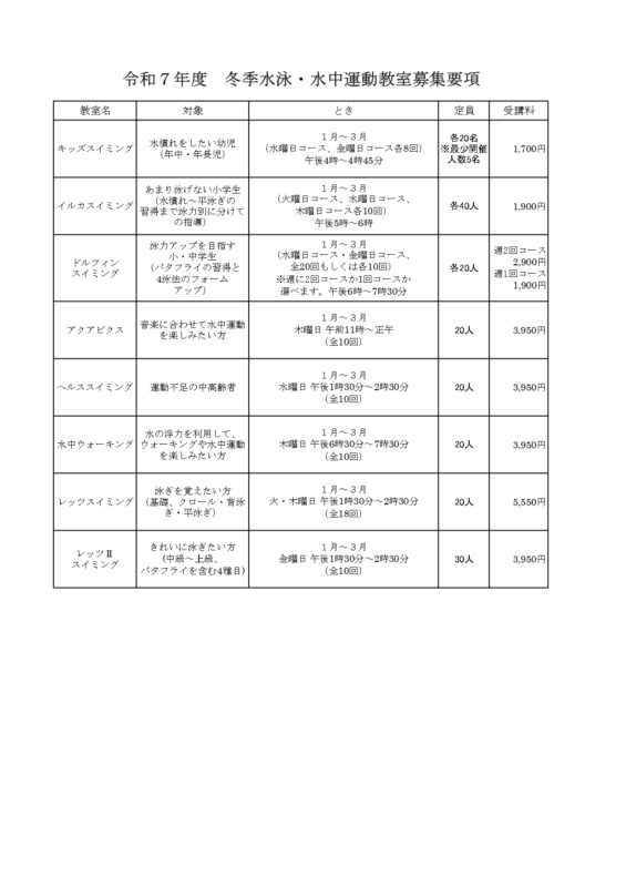 冬季水泳教室PDFはこちら⇒冬季水泳教室募集要項